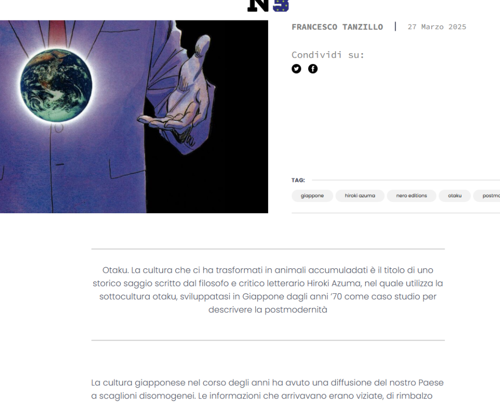 Continuiamo quindi sul tema della crisi della post-modernità, allargando un po’ lo sguardo anche al Sol levante grazie a Francesco Tanzillo. Molto bella la sua riflessione sull’opera di Hiroki Azuma e il suo studio sul fenomeno ”Otaku”. Azuma è uno degli studiosi che ha capito l’importanza di cambiare prospettiva sulla “sottocultura” che forse meglio esprime il cambio di paradigma culuturale negli anni 90. La sua opera è riuscita ad attraversare i confini del giappone grazie soprattutto alla definizione felice di “animale accumuladati” che ancora oggi risulta essere uno strumento molto utile per interpretare il nostro frastagliato  presente