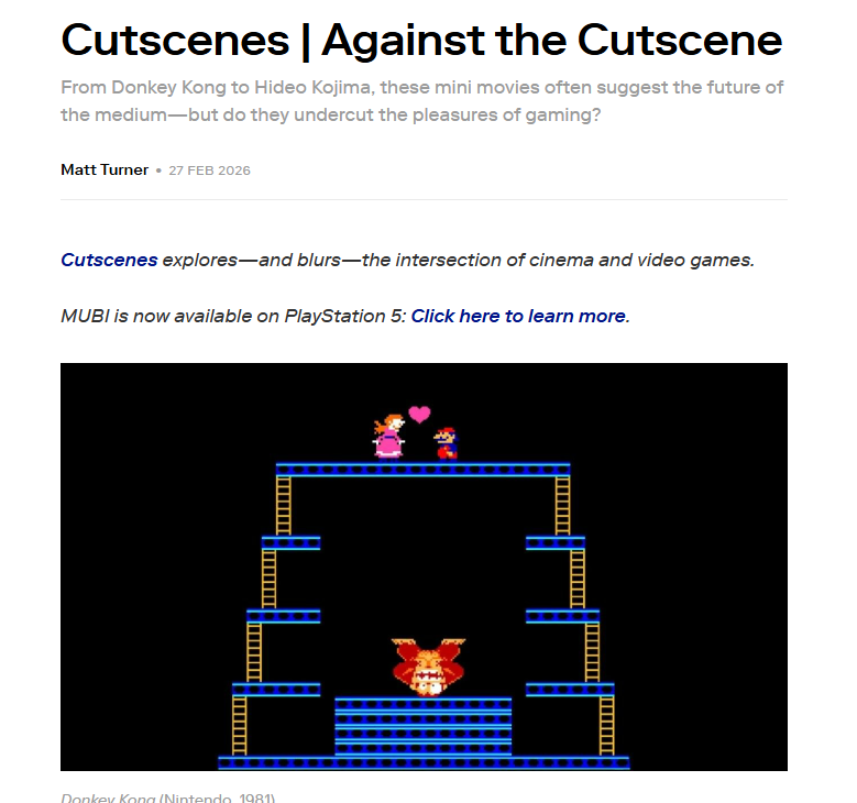 In questo bell’articolo, Matt Turner ricostruisce un po’ la loro storia, focalizzandosi soprattutto sull’itinerario che ha portato, negli ultimi anni, a farle diventare uno degli elementi più criticati in ambito videoludico. In quanto “prestito” del linguaggio cinematografico e della sua “passività”, la tesi è che le cutscene sarebbero un depotenziamento del linguaggio videoludico e che quindi andrebbero superate in favore di strumenti più adatti al medium,  come per esempio  la “narrazione ambientale”