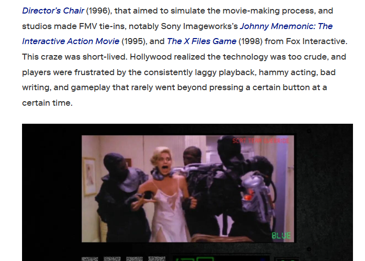 Anche qui, per approfondire,  vi riporto una bella intervista a lui e alla produttrice del suo ultimo titolo che può aiutare a capire meglio la meccanica di gioco, la filosofia sottesa e che riporta anche una breve storia del genere degli FMV.