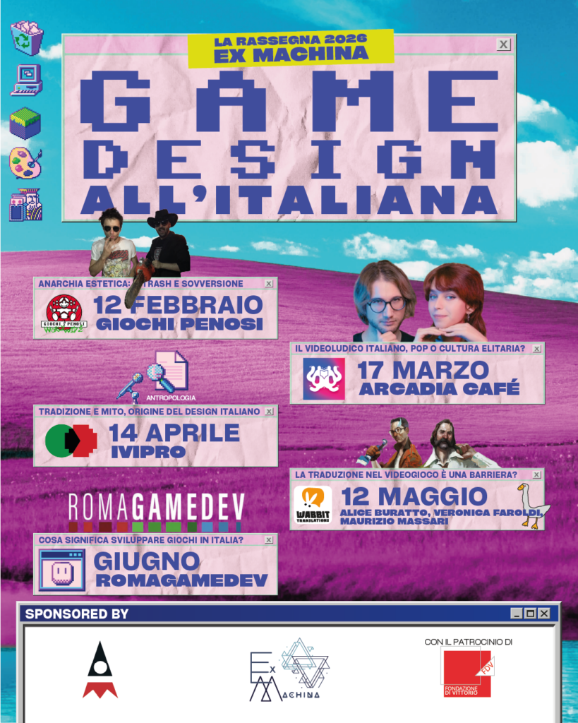 EX MACHINA promuove CICLI DI INCONTRI APERTI sui temi caldi del mezzo videoludico, sotto diversi focus e con una continuità intellettuale precisa: esplorare ciò che il videogioco ha da dire, come mezzo espressivo e come “luogo” digitale all’interno del quale “succedono cose”, esplorare il senso degli eventi che il videogioco fa accadere e che accadono attorno al videogioco.